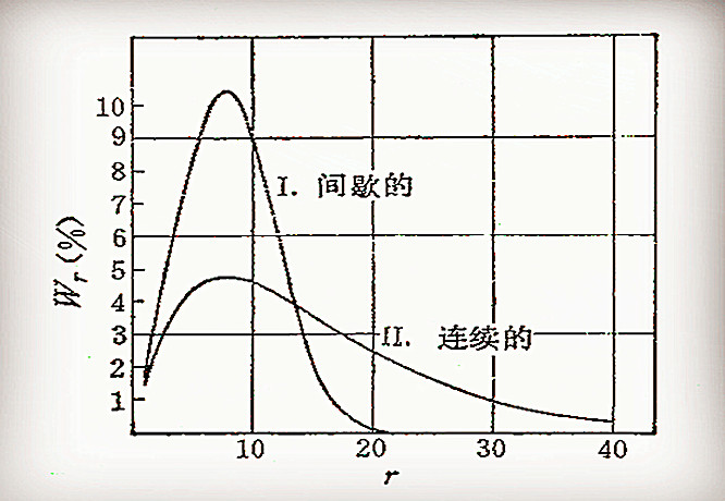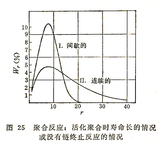 幾種計算所得的分布曲線如圖25所示,其中Wr為單體鏈長r倍的分子在總產(chǎn)物中所占的重量百分數(shù)。