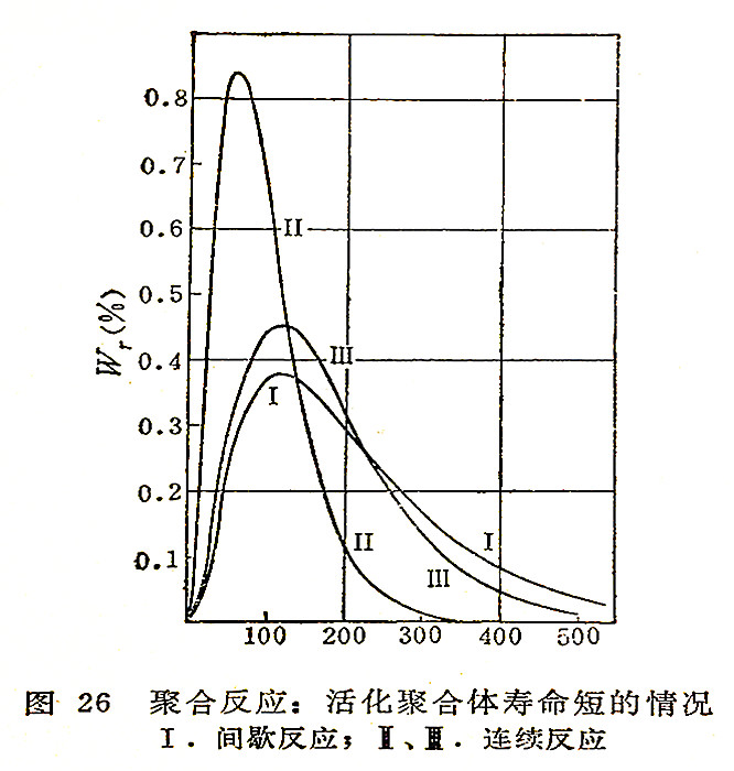 另一種情況,包含自由基或離子反應(yīng)機理所進行的聚合反應(yīng),這時由于發(fā)生如同二個自由基結(jié)合的終止過程,故這些活化增長中心的壽命可能極短。如果這些活化增長中心的平均壽命比在連續(xù)攪拌釜式反應(yīng)器中的平均逗留時間短得多時,上面所講的因素(a)影響很小,而因素(b)趨向于占優(yōu)勢。在這些條件下,可以證明,對許多類型的引發(fā)和終止機理,分子量分布將比從間歇過程所得到的來得窄。圖26表示了一些計算得到的曲線。