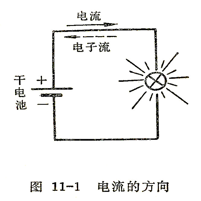 水在河里流動叫做水流,同樣,電子在導體中流動就叫做電流,用“I”表示。例如,把一節(jié)干電池用電線和一個小電珠連接起來(如圖11-1),由于電池負極上積聚了大量電子,互相排斥,而電池正極上積聚了大量正電荷,對電子有很強的吸引力,因此,電路中的自由電子就沿著導線從電池負極向電池正極方向移動,形成電流。當電流流過小電珠時電珠發(fā)出亮光。我們稱干電池為電源,稱小電珠為負載,而連接電源和負載的電線叫做導線。但是,電流的方向習慣上規(guī)定由電源的正極經過負載流回電源的負極,也就是說,電流的方向和電子實際流動方向恰好相反。