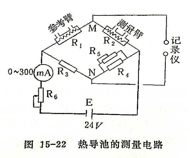 由圖15-21看到,金屬熱導(dǎo)池是在金屬塊上鉆兩個(gè)平行的孔即直通式池槽),兩個(gè)孔內(nèi)各吊上一根鎢絲,兩根鎢絲的電阻值要相等,一個(gè)孔內(nèi)的鎢絲僅有載氣通過,叫做“參考臂”,另一個(gè)孔內(nèi)的鎢絲通過由色譜柱出來的樣品和載氣,叫做“測量臂”。由熱導(dǎo)池的參考臂和測量臂、池外的兩個(gè)電阻、電源和其它附件,就構(gòu)成惠斯頓電橋的線路,也就是熱導(dǎo)池的測量電路。如圖15-22所示。