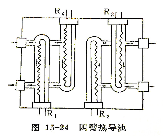 ① 熱絲阻值:熱絲阻值愈大,其靈敏度愈高。為提高靈敏度有些色譜儀中常用四臂熱導(dǎo)池(如圖15-24),即除R1、R2用鎢絲外,R3R4兩個(gè)固定電阻也換成鎢絲,此時(shí)若把R1、R4作參考臂,則R2、R3就作測量臂,當(dāng)然R1、R2、R3、R4四個(gè)臂鎢絲的阻值應(yīng)當(dāng)相等。四臂熱導(dǎo)池的熱絲阻值比雙臂熱導(dǎo)池增加一倍,所以其靈敏度也要提高一倍。對雙臂熱導(dǎo)池,若橋路中R3、R4阻值是R1(參考臂)、R2(測量臂)阻值的五倍時(shí),其靈敏度可與四臂熱導(dǎo)池相當(dāng)。在四臂熱導(dǎo)池橋路中,適當(dāng)串入固定電阻,在同樣橋流下,靈敏度也顯著增加。