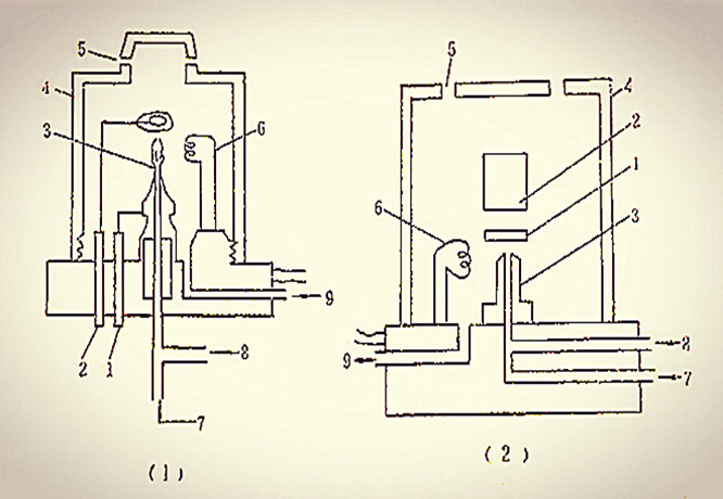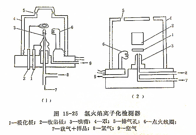 用不銹鋼制成的離子化室,結(jié)構(gòu)分為兩種,一種高壓電場的正極和噴嘴相連,負(fù)極用圓盤形鉑絲,如圖15-25(1)所示。另一種高壓電場的正極不和噴嘴相連,而用鉑絲作成圓環(huán)(也叫極化電壓環(huán))安裝在噴嘴之上,負(fù)極作成圓筒狀收集電極,為了點(diǎn)燃?xì)錃饪刹捎酶邏狐c(diǎn)火或熱絲點(diǎn)火。后一種結(jié)構(gòu)的離子化室多用于商品色譜儀中,如圖15-25(2)所示。
