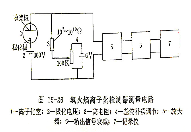 氫火焰離子化檢測器僅產(chǎn)生微弱的電流(10(-8次方)~10(-4次方)安),需經(jīng)微電流放大器放大后,才適于記錄儀記錄。常用的測量電路如圖15-26所示。