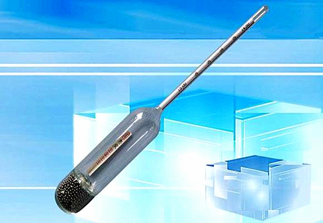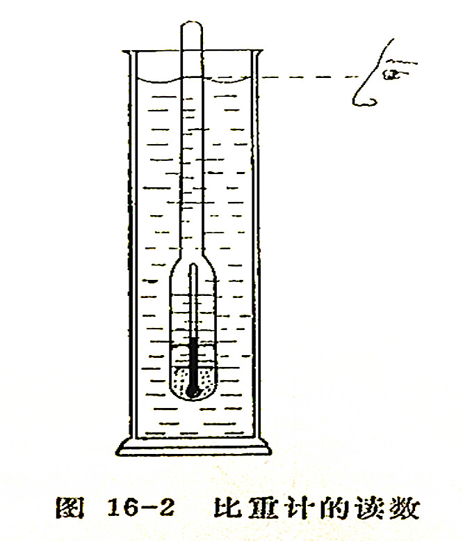 ② 先估計(jì)試樣比重的大致范圍,然后取出具有相應(yīng)刻度的比重計(jì)。手執(zhí)干凈比重計(jì)的上端,小心置于量筒中(圖16-2)勿使比重計(jì)與量筒底及量筒壁相接觸。當(dāng)擺動(dòng)停止后,按彎月面的上緣進(jìn)行讀數(shù),讀數(shù)時(shí)眼晴應(yīng)與彎月面上緣平行。同時(shí),按照比重計(jì)上的溫度計(jì),或另用溫度計(jì),測定試樣的溫度t。在測定不透明試樣的比重時(shí),可將比重計(jì)或溫度計(jì)稍微提起,至能看見水銀柱上端為止。