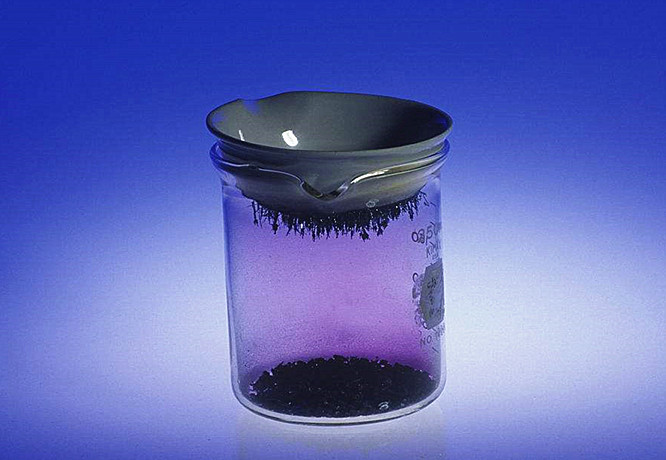 碘是固體,它生成具有真正金屬光澤的灰色晶體。它像是金屬,閃著紫色的光,但是如果我們把金屬似的碘的晶體放在玻璃瓶里,那么很快就可以看出瓶的上部有紫色的蒸氣:碘不經(jīng)過液態(tài),很容易升華。