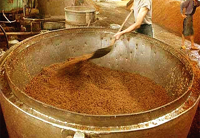 (2)蒸煮 將所用原料經(jīng)洗凈、粉碎處理后,加水調(diào)成漿狀(有時(shí)還要拌入4~8%粗糠等填料以增加其透氣性),然后加熱至130℃進(jìn)行高壓蒸煮。這時(shí),淀粉受熱吸水膨脹,顆粒破裂,形成淀粉糊。這樣的淀粉粒就容易被糖化劑中的酶作用而分解成單糖。所以蒸料要蒸得透,否則會(huì)造成糖化困難。