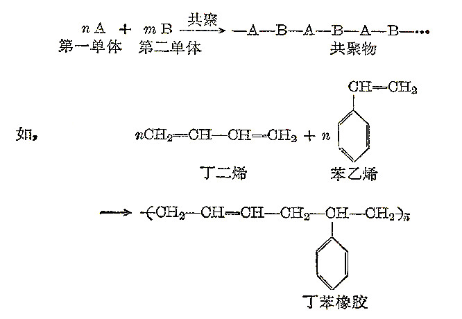 從這些單體出發(fā),經(jīng)過聚合反應(yīng),就可得到各種合成橡膠。在合成橡膠中,除了由一種單體參加聚合得到均聚物(如順丁橡膠)外,也有許多是由二種或二種以上單體通過共聚反應(yīng),制得共聚物(如丁苯橡膠)。即:
