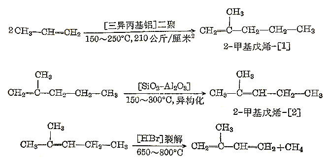至此,我們看到了合成橡膠雖然在某些性能方面超過了天然橡膠,但在加工性能、彈性、耐寒性等方面還不如天然橡膠,而且做成的輪胎在行駛時(shí)生熱量大。因此人們就努力設(shè)法合成一種非常近似于天然橡膠的合成橡膠,于是發(fā)展了異戊橡膠。異戊橡膠的單體是異戊二烯。近年來,由于石油化工的迅速發(fā)展,從煉廠氣得到的丙烯經(jīng)過二聚、異構(gòu)化、裂解反應(yīng),或者從油田氣、輕汽油、石油加工過程中得到的C5成分——異戊烷和異戊烯——經(jīng)脫氫后,都可大量制得異戊二烯。