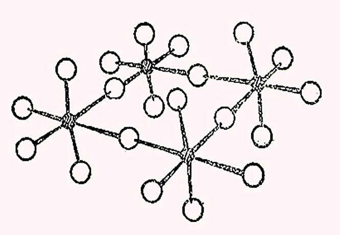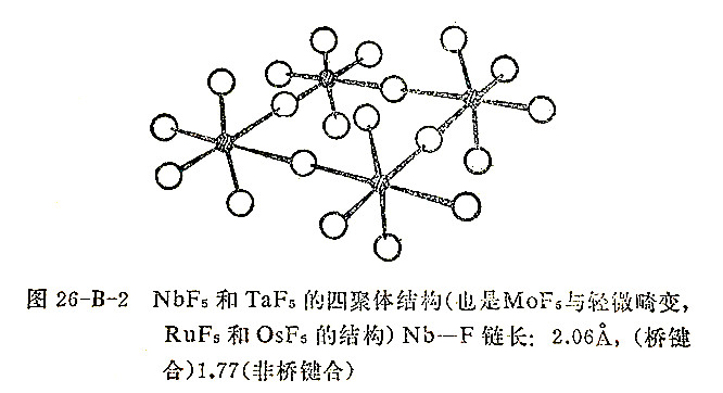 直接用金屬或五氯化物氟化,可制得五氟化物。二者是易探發(fā)的自色固體(Nb熔點80℃,沸點235℃;Ta熔點95℃,沸點229℃)產(chǎn)生無色液體和蒸氣。它們有四聚體的結(jié)構(gòu),見圖26-B-2;當其熔化時它們顯然也是多聚體。氟氧化物MOF3和MO2F是已知的。