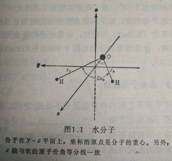 如圖1.1所所示,水分子結(jié)構(gòu)的形狀是以氧原子為頂點(diǎn)的等腰三角形,許多研究者對(duì)O一H原子間的距離以及氧原子的價(jià)角進(jìn)行了正確的測(cè)定。三種主要水分子的原子間距離,