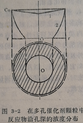反應(yīng)物在多孔催化劑顆粒中沿深度的濃度分布示于圖3-2中曲線1和曲線2為反應(yīng)在動力學(xué)區(qū)和內(nèi)擴(kuò)散區(qū)進(jìn)行時反應(yīng)物濃度分布??梢娫趧恿W(xué)區(qū)顆粒中心的濃度與顆粒外表面的濃度接近。但在內(nèi)擴(kuò)散區(qū),越向顆粒中心濃度越低。反應(yīng)物在顆粒中心的濃度近似于零。這時得下列不等式: