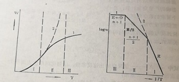 與圖3-3相應(yīng)的反應(yīng)速度常數(shù)的對數(shù)與絕對溫度倒數(shù)的關(guān)系繪于圖3-4。直線(虛線)對應(yīng)于反應(yīng)在動力學(xué)區(qū)進(jìn)行。曲線1的Ⅰ段對應(yīng)著在較低溫度下進(jìn)行反應(yīng)的動力學(xué)區(qū),這時反應(yīng)的活化能和反應(yīng)級數(shù)都是真實(shí)的。曲線1的Ⅱ段,對應(yīng)于中溫的內(nèi)擴(kuò)散區(qū),這時表觀的活化能和反應(yīng)級數(shù)分別為E/2和(n+1)/2。曲線1的Ⅲ段,對應(yīng)著高溫的外擴(kuò)散區(qū),這時活化能近于零E→0,反應(yīng)級數(shù)n=1。