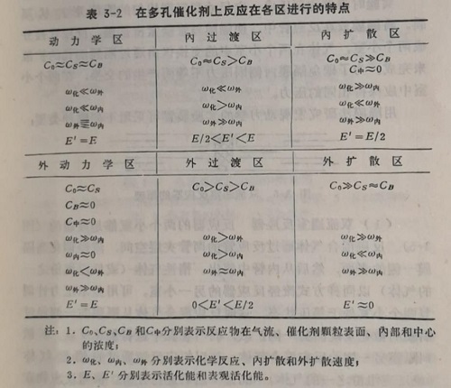 由于條件不同,過程可能在不同的區(qū)域里進(jìn)行。反應(yīng)在各區(qū)進(jìn)行的特點(diǎn)列于表3-2。催化劑內(nèi)表面利用率決定于過程進(jìn)行的區(qū)域,因而與其宏觀結(jié)構(gòu)有關(guān)。