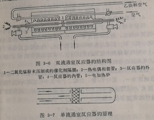 研究乙炔氧化宏觀動力學(xué)的雙流通室反應(yīng)器的結(jié)構(gòu)繪于圖6。反應(yīng)管中的催化劑隔膜是用二氧化錳粉末壓成。經(jīng)過預(yù)熱的乙和空氣的混合物流經(jīng)隔膜的一面,這一面模擬催化劑顆粒的外表面??諝饨?jīng)過預(yù)熱后以一定速度通過隔膜的另一面,這一面模擬催化劑的顆粒中心。乙炔和空氣的混合物由隔膜的一面沿隔膜中的孔道向另一面擴(kuò)散,并進(jìn)行氧化反應(yīng)。因而,擴(kuò)散到另一面的反應(yīng)物和反應(yīng)產(chǎn)物的混合氣體被流過的空氣“洗去”。然后進(jìn)行分析。當(dāng)沒有催化反應(yīng)時,乙炔在隔膜中的濃度梯度應(yīng)當(dāng)保持線性關(guān)系。根據(jù)在兩種情況下乙炔濃度的變化,即可算出在二氧化錳上乙炔的擴(kuò)散速度和反應(yīng)速度,以及物質(zhì)擴(kuò)散過程對乙炔氧化反應(yīng)速度的影響。