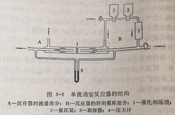 (1)雙流通室反應(yīng)器反應(yīng)器的兩個小室都是流通的(圖3-5)。反應(yīng)混合氣體通過反應(yīng)管的兩管夾層空間,流經(jīng)化劑隔膜一側(cè)的表面,然后從內(nèi)管中流出。性氣體(或反應(yīng)組份之的氣體)以同樣方式流經(jīng)反應(yīng)器的另一小室??捎貌钍緣毫τ?jì)調(diào)節(jié)兩個小室處于等壓狀態(tài)。這時反應(yīng)混合氣體從隔膜的一側(cè)經(jīng)過隔膜的微孔系統(tǒng)向另一側(cè)擴(kuò)散,同時在孔中進(jìn)行化反應(yīng)。擴(kuò)散到隔膜另一側(cè)的反應(yīng)混合氣體,被以恒定流速通過的性氣體(或反應(yīng)組份之一的氣體)“洗去”。然后進(jìn)行分析。根據(jù)反應(yīng)物在隔膜兩側(cè)的濃度變化,就能確定反應(yīng)物通過催化劑的反應(yīng)速度和擴(kuò)散速度。