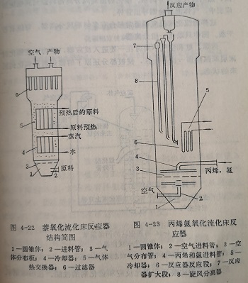 這類大型反應(yīng)器的結(jié)構(gòu)之一如圖4-23所示??諝庥蓤A錐體都的進(jìn)料管導(dǎo)入,經(jīng)空氣分布板進(jìn)入催化劑層,向上再經(jīng)一段距離與來自進(jìn)料管的丙烯、氨混合,于是進(jìn)行反應(yīng)。反應(yīng)放出的熱量由冷卻器中的水帶走。反應(yīng)后的混合氣體由反應(yīng)段上升到擴(kuò)大段,然后進(jìn)入旋風(fēng)分離器。催化劑由旋風(fēng)分離器料腿回到催化劑床層中,氣體混合物則導(dǎo)出管外。