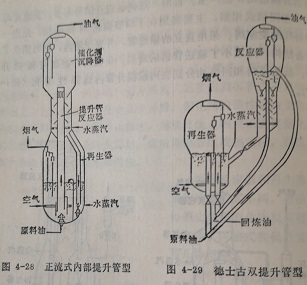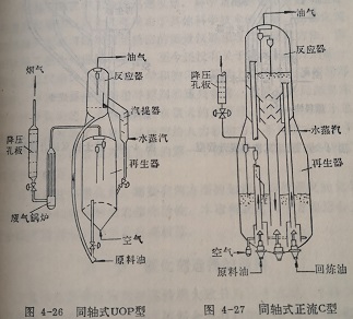 UOP型的反應(yīng)器置于再生器上,由于反應(yīng)器與再生器同軸排列,所以裝置緊湊、占地面積小,但是裝置較高,催化劑輸送管道的磨損也比型產(chǎn)重。目前,這類裝置在國外最多。正流式與UOP型同軸式相似,主要差別在于詞節(jié)化劑循環(huán)量,先用一種特殊的旋塞、采用直立的輸送管,并置于內(nèi),從而簡化了設(shè)備結(jié)構(gòu),并減小了輸送管道的磨損。正流式C型有兩根提升管,新鮮原料和回?zé)挿謩e在兩根提升管內(nèi)選擇性裂化(圖一27)