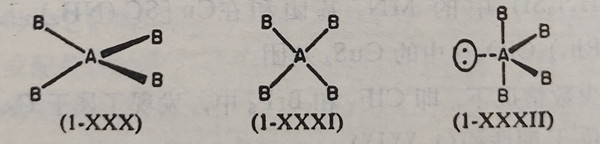 當除了四對用于成鍵的電子外,還存在著兩對電子時,非過渡元素中心原子也能生成四方形構(gòu)型,這兩對電子分別位于分子平面的上下方。例如XeF4和(lCl3)2。類似地,當有一對“額外”電子對存在時,像SF4,則采取不規(guī)則排列的C2v對稱性(1-XXXII)。在第四章詳細討論這些非過渡元素結(jié)構(gòu)。