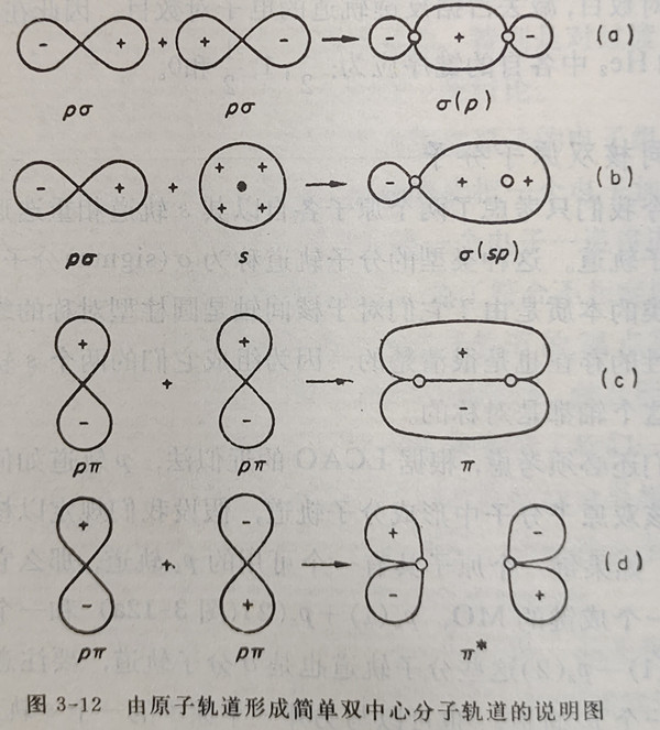 如果pz軌道是一個(gè)pα軌道,那么px和py軌道都不是pα軌道而是p兀軌道。一個(gè)兀-型軌道其節(jié)面包括分子軸,所以兀軌道不是對(duì)此軸圓柱形對(duì)稱,而是在包含這個(gè)軸的兩邊具有相等的電子密度,可是在兩邊的波函數(shù)本身符號(hào)相反,兩個(gè)這樣的p兀軌道可以合成一個(gè)成鍵的兀MO,p兀(1)+p兀(2)和一個(gè)反鍵的兀MO,p兀(1)-p兀(2)這兩個(gè)分別簡(jiǎn)單地以兀和兀*表示,它們的形成在圖(3-12c)和(3-12d)中說明之。