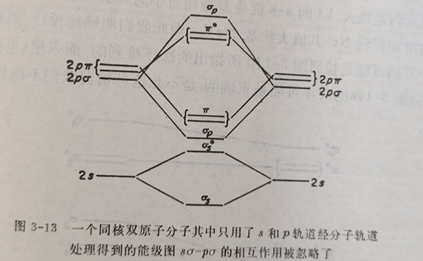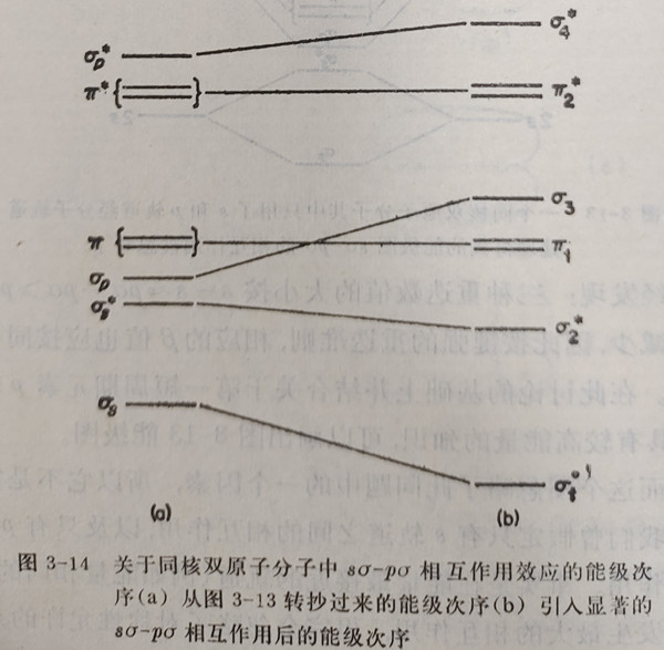 然而這個(gè)圖忽略了此問題中的一個(gè)因素,所以它不是完全正確的。我們?cè)俣ㄖ挥衧軌道之間的相互作用,以及只有pα之間的相互作用。事實(shí)是在能量最接近的軌道(例如能量相同的軌道)之間應(yīng)發(fā)生最大的相互作用,但完全忽略了對(duì)稱性允許的共他相互作用是錯(cuò)誤的。實(shí)際上,在s和pα軌道之間也有相互作用,一神考慮方式是保留圖3-13,把它作為一級(jí)近似,然后進(jìn)一步引人相互作用的效應(yīng)。從本質(zhì)上這是相同類型的兩個(gè)軌道間的排斥,也就是兩個(gè)α軌道和兩個(gè)α*軌道之間的排斥作用。圖3-14指明了引人這些相互作用的效應(yīng),(a)部分是原先得到的次序(圖3-13),而(b)部分表示新的次序?,F(xiàn)參照?qǐng)D3-14我們看出,如果這些變化是足夠大的話,在能級(jí)定性次序上也可能有變化,正如圖3-14b示出的那樣,第三個(gè)最低軌道可能是兀軌道,而不是一個(gè)α軌道。當(dāng)s和p軌道之間的能差最小時(shí)它們相互作用最大,因而能量改變程度將是最大,Li的s-p能量差是相當(dāng)小的(約2eV)以后有規(guī)律的增加直到Ne,其值大約是27eV。因此我們明確地預(yù)計(jì),周期系一開始可能是按照?qǐng)D3-14b所指出的次序排列的,而末尾(也就是F2)圖3-14a的次序可能是正確的,是不是這種情況我們不能肯定,但是根據(jù)實(shí)驗(yàn)數(shù)據(jù)圖3-14b的模式至少對(duì)于象N2這樣的分子確實(shí)是存在的。