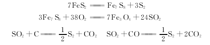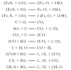 (2)沸騰焙燒法硫鐵礦用沸騰焙燒產(chǎn)生的二氧化硫氣體,經(jīng)除塵后與鼓風(fēng)進(jìn)行混合,在還原爐中加入無(wú)煙煤或通入半水煤氣進(jìn)行還原,再經(jīng)轉(zhuǎn)化器、冷凝器、泡罩塔后放空。液態(tài)硫磺由冷凝器、泡罩塔放出經(jīng)過(guò)濾即得硫磺成品。其主要反應(yīng)式如下。
