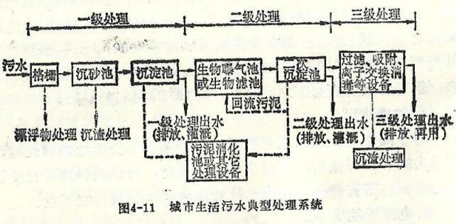 城市污水處理方法:城市污水可分為生產(chǎn)污水與生活污水兩大類。生產(chǎn)污水由于工業(yè)生產(chǎn)的復(fù)雜性其成分可以相差很大,有些生產(chǎn)污水與生活污水的性質(zhì)相近,可直接與生活污水一起進(jìn)入污水處理廠。生活污水的水質(zhì)都比較接近,它們一般不含有毒物質(zhì),而有機(jī)物含量較高。污水中的污染物可分為無(wú)機(jī)鹽(泥沙和各種無(wú)機(jī)鹽類)、有機(jī)物(蛋白質(zhì)、油脂、纖維素、碳水化合物等)和微生物I (細(xì)菌、病原菌、寄生蟲卵等)三類。污水處理系統(tǒng)是根據(jù)排入水源的污水需要處理至什么程度來(lái)選擇的。處理系統(tǒng)見圖4-11。