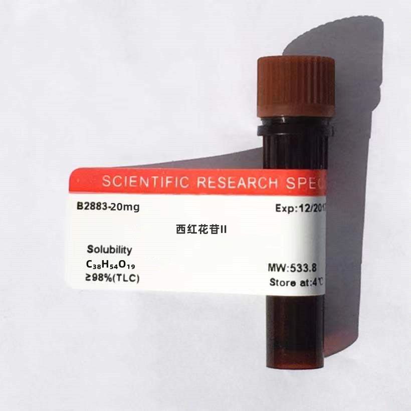 西紅花苷II是紅色結(jié)晶粉末,可溶于甲醇、乙醇、DMSO等有機(jī)溶劑,密度:1.47 g/cm3。沸點(diǎn) 1032.1℃。閃點(diǎn) 309.8℃。折射率 1.636℃。
