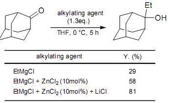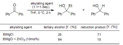 相關(guān)反應(yīng)1. 在格氏試劑乙基氯化鎂中添加一定量的氯化鋅,與酮類反應(yīng),可以得到高產(chǎn)率的三級醇,并且可以減少副反應(yīng)發(fā)生。