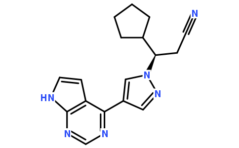 化學(xué)性質(zhì)魯索替尼是一種白色至米色固體。溶于甲醇和二甲亞砜。熔點(diǎn)84-89°C密度1.40儲(chǔ)存條件-20°溶解度可溶于DMSO(高達(dá)28mg/ml)或乙醇(加熱時(shí)高達(dá)15mg/ml)。魯索利替尼(ruxolitinib、INCB18424)是強(qiáng)效的,選擇性JAK1和JAK2抑制劑(IC50分別為2.7和4.5nM),具有強(qiáng)效的抗腫瘤和免疫調(diào)節(jié)活性。Ruxolitinib抑制IL-6信號(hào)(IC50=281nM)和JAK2V617F+Ba/F3細(xì)胞增殖(IC50=127nM)。Ruxolitinib也可以抑制野生型JAK2和JAK2V617F突變體病人中STAT3的磷酸化。臨床應(yīng)用于它能顯著降低循環(huán)炎性細(xì)胞因子的水平有關(guān)。在大鼠佐劑性關(guān)節(jié)炎和多重鼠科關(guān)節(jié)炎模型中ruxolitinib具有有效作用。