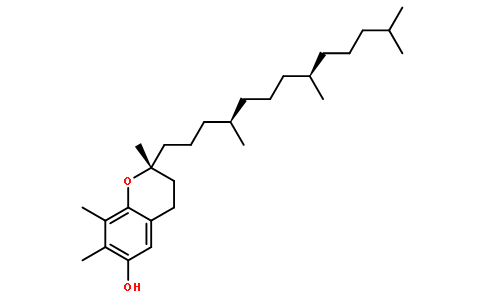 化學性質(+)-γ-維生素E又稱D-gamma-生育酚是一種有機物,為淡黃色至棕色黏稠油狀液體,對空氣和光敏感。露置空氣中色漸變深。在自然界常與α型、β型并存,但生物活性低于α型;對熱和堿極穩(wěn)定,能被大氣中的氧緩慢氧化,鐵鹽和銀鹽使氧化加速,毛地黃皂苷(Digi→nin)不能使其沉淀。λmax:298nm(ε1%,1cm92.8)。易溶于油、脂肪、丙酮、乙醇、氯仿、乙醚和其他脂肪溶劑,不溶于水,密度:0.933g/cm3,沸點:200 °C (0.1 mmHg),閃點:206ºC,折射率:n20/D 1.505,比旋光 [α]25/D30º(c=2;2,2,4-Trimethylpentane),冷藏品-2-8℃。生育酚主要有四種衍生物,按甲基位置分為α、β、γ和δ四種。與生育酚相關的化合物生育三烯酚在取代基不同時活性是一定的,但生育酚的活性會明顯降低。