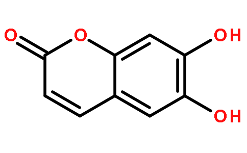化學(xué)性質(zhì)6,7-二羥基香豆素又稱秦皮甲素是一種屬香豆素類化合物,為黃色結(jié)晶粉末,無氣味,味淡苦。真空中升華,冷凝后成葉狀結(jié)晶。Λmax:344(MeOH)。溶于二甲亞砜、N,N-二甲基甲酰胺、丙酮、熱乙醇、冰乙酸和稀堿溶液,微溶于水、乙醇和乙酸乙酯,不溶于乙醚和氯仿,密度:1.563 g/cm3,沸點(diǎn):469.7ºC at 760 mmHg,熔點(diǎn):271-273°C(lit.),閃點(diǎn):201.4ºC,折射率:1.594,常溫,具刺激性。
